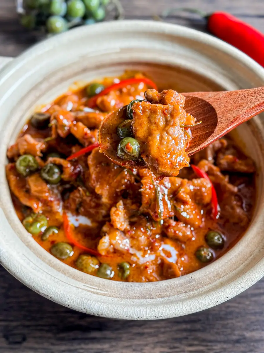 In Thailand, you’ll sometimes see pea eggplants added for texture and a gentle bitterness that balances the richness. I include them here for that reason, but they’re completely optional.
