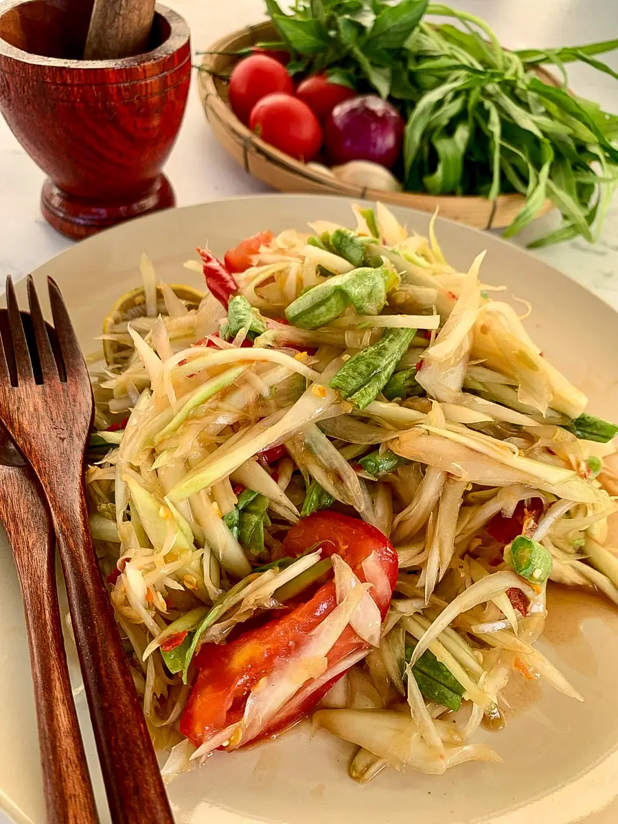 The first time you try it, the flavor can feel strong. That’s normal. It’s a stronger, more intense version of som tam Thai. This one is saltier, funkier, and a bit more addictive once you get used to it.